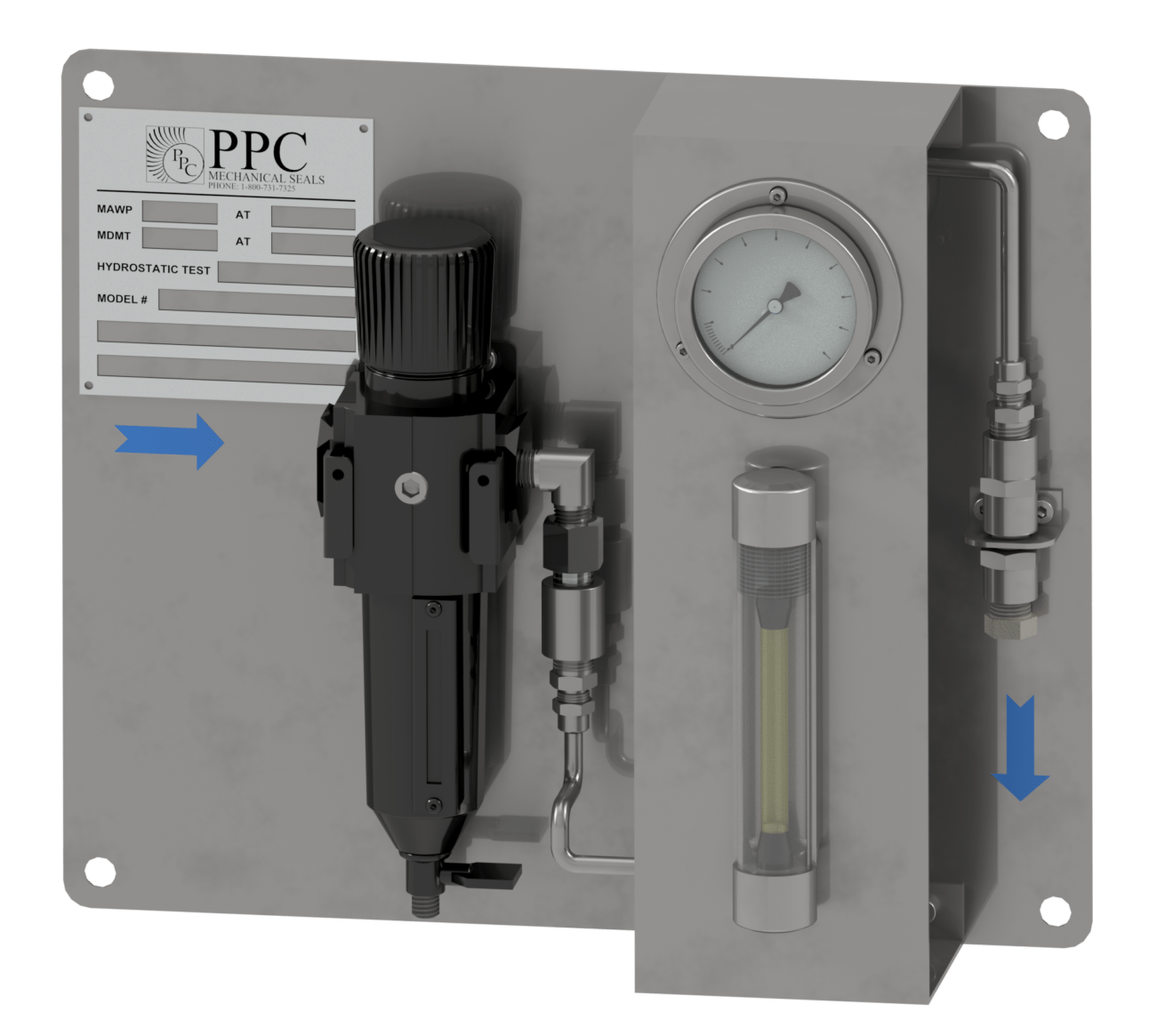 With a Plan 74 gas panel from PPC: clean, monitor, and regulate an external gas source to be used as a barrier in a double seal. The all-in-one panel system is typically used on lift-off gas seals such as the PPC 7000G/GB but can find use in contacting gas seals as well.